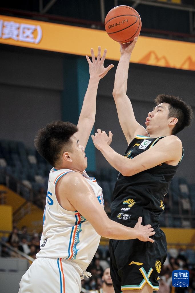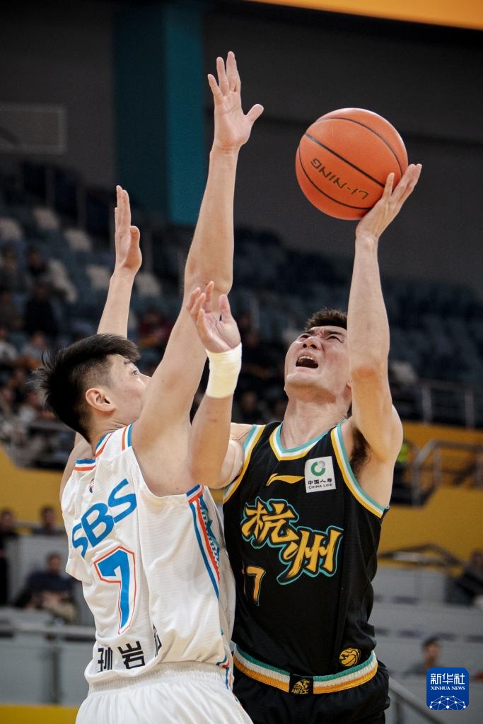 3月19日,浙江東陽光藥隊球員朱俊龍(右)在比賽中投籃。新華社記者 江漢 攝