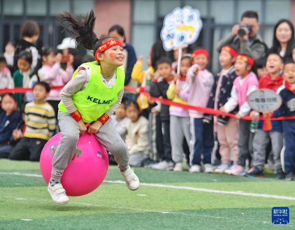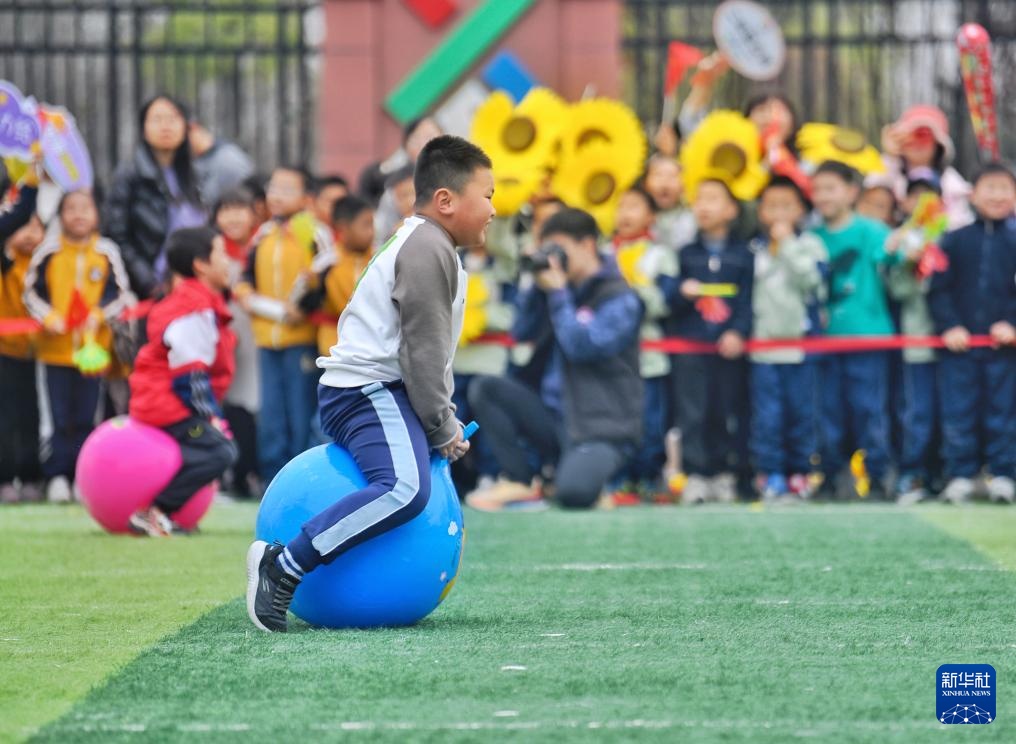 3月20日,學生在運動會上參加跳跳球接力賽。新華社記者 劉坤 攝