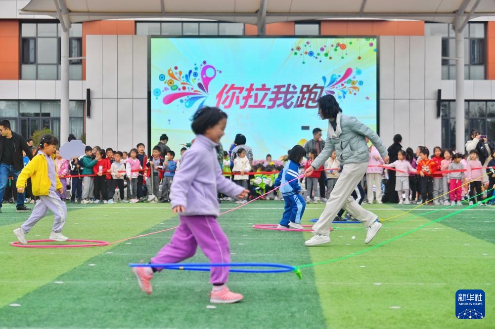3月20日,學生與家長在運動會上參加“你拉我跑”接力賽。新華社記者 劉坤 攝