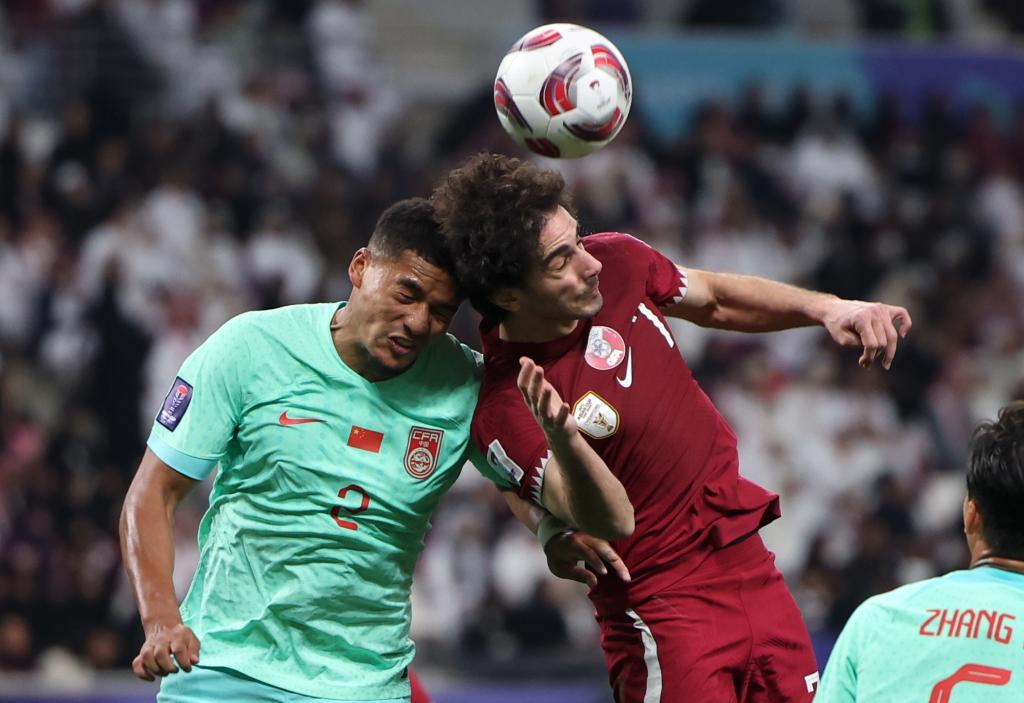 1月22日的亞洲杯小組賽中,中國(guó)隊(duì)球員蔣光太(左)與卡塔爾隊(duì)球員艾哈邁德·阿拉丁爭(zhēng)頂。新華社記者 曹燦 攝