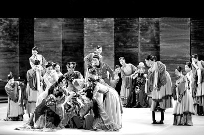 小說《紅樓夢》全書共120回,詳盡地寫出了賈王史薛四大家族的興衰歷程。民族舞劇《紅樓夢》通過有側重的取舍,將龐大的故事篇章改編成2小時左右的舞劇作品,在結構布局上格外用心。該劇采取章回體的形式,分為“入府”“幻境”“含酸”“省親”“游園”“葬花”“元宵”“丟玉”等12個篇章,以寶玉和黛玉、寶釵的愛情故事為主線串聯起紅樓一夢。劉姥姥進大觀園、元妃省親、黛玉葬花等經典段落在舞劇中都有大篇幅的呈現。劇中并沒有華麗的制景,卻能把觀眾帶進大觀園的氛圍和人物內心。如十二釵站在十二張立起的椅子上的一段群舞,配合著冷色調幽閉的燈光,十二釵更像是冷峻的雕塑群像,命運的起伏霎時呈現在觀眾面前。