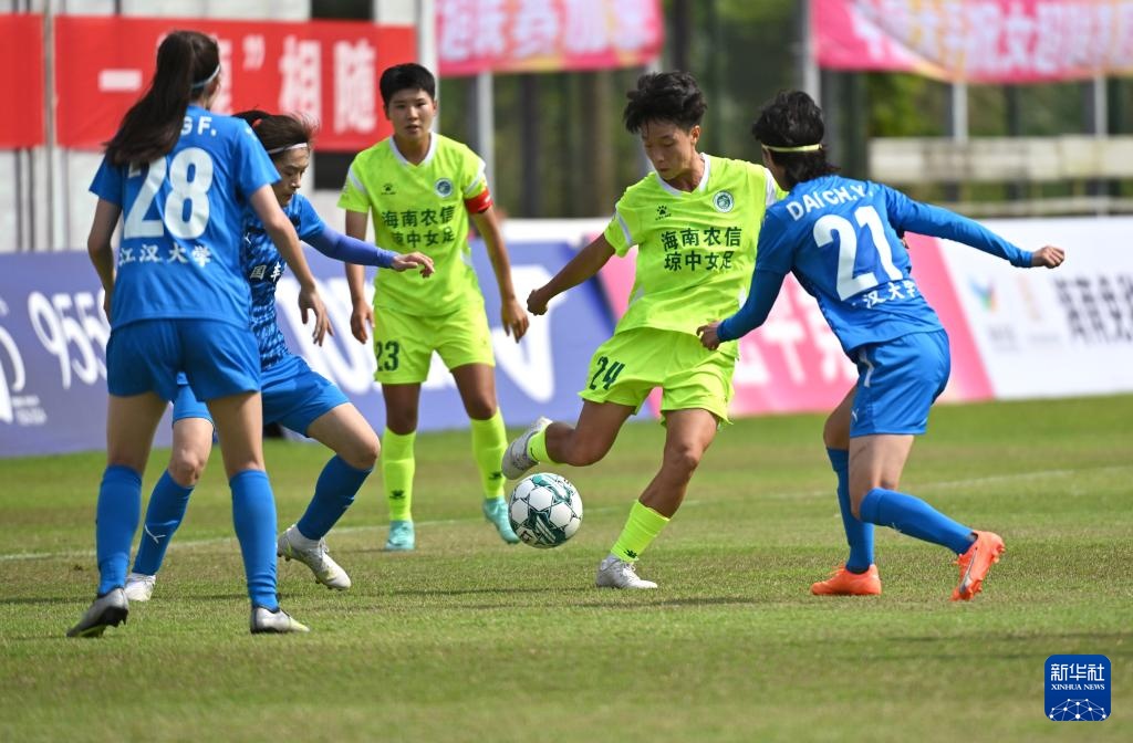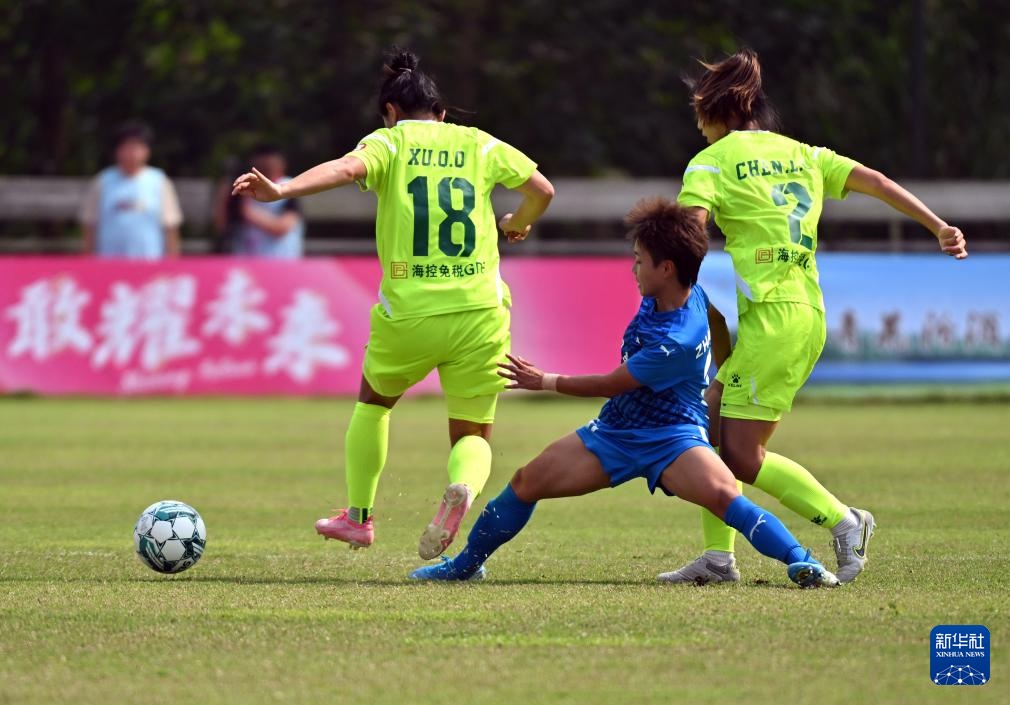 3月23日,海南農信瓊中女足隊球員蘇育萱(右二)在比賽中傳球。新華社記者 郭程 攝
