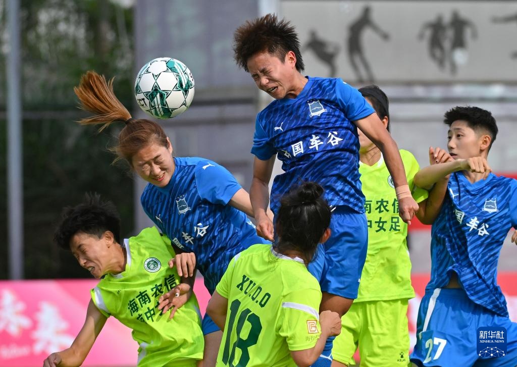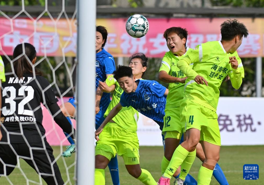 3月23日,海南農信瓊中女足隊球員宋宇晴(右二)在比賽中爭頂。新華社記者 郭程 攝