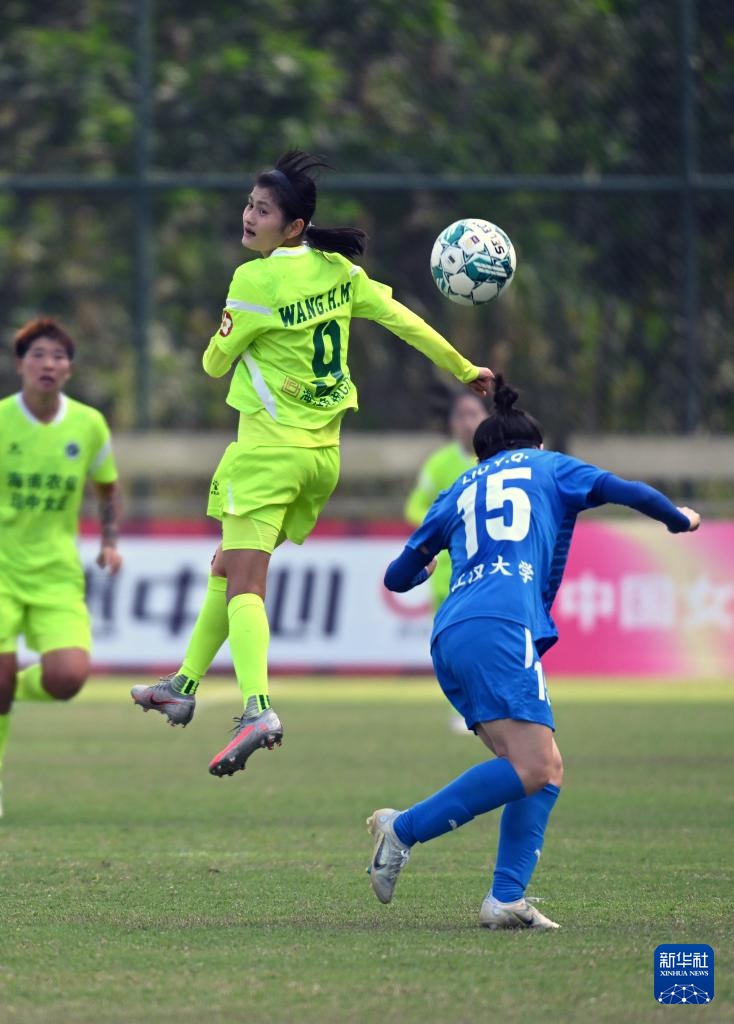 3月23日,海南農信瓊中女足隊球員王慧敏(上)在比賽中爭頂頭球。新華社記者 郭程 攝