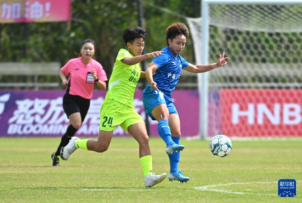 3月23日,武漢車谷江大隊球員張琳艷(右)和海南農信瓊中女足隊球員蘇育萱在比賽中拼搶。新華社記者 郭程 攝