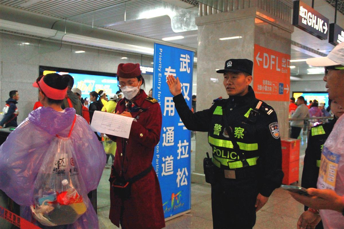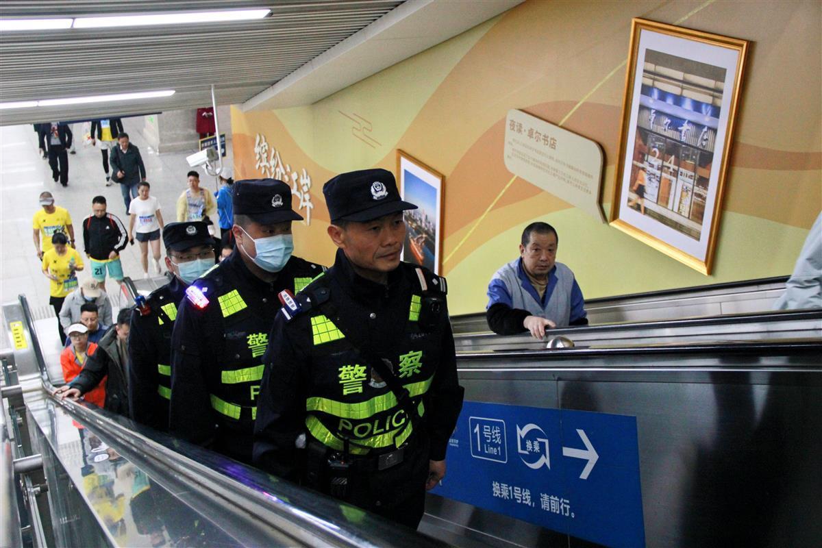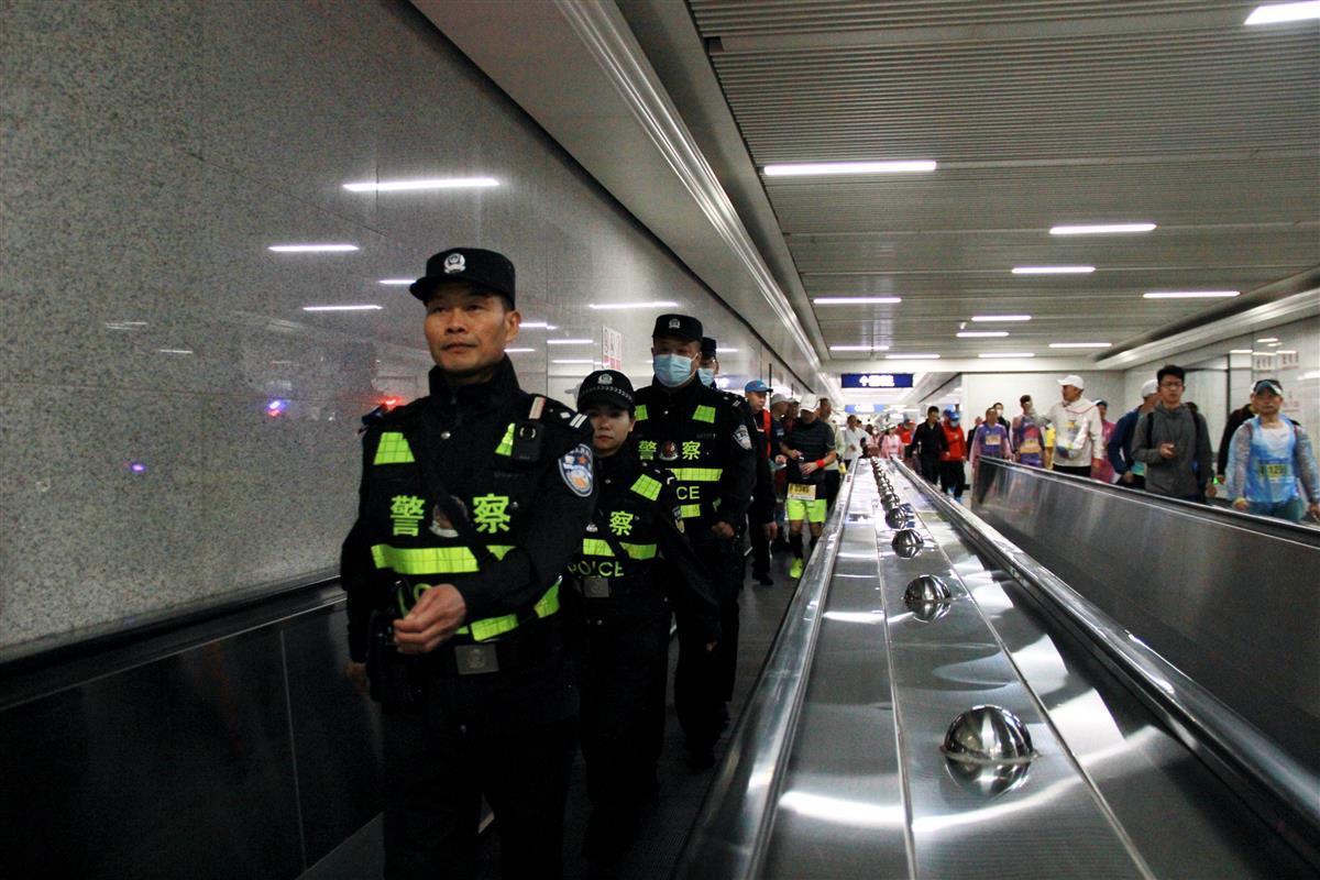 “你可以直接從L口出站,出站后往三陽路路口步行500米左右就到了。”站臺上,不少“跑友”找到民警吳長安,詢問他該從哪個口出站前往起點(diǎn),吳長安耐心細(xì)致地予以解答。吳長安介紹說,今天一共在三陽路地鐵站投入警力20余人,大家分組值守在出入口、站臺、地鐵通道等重要部位,在維護(hù)治安秩序的同時,隨時接受大家的報(bào)警求助。