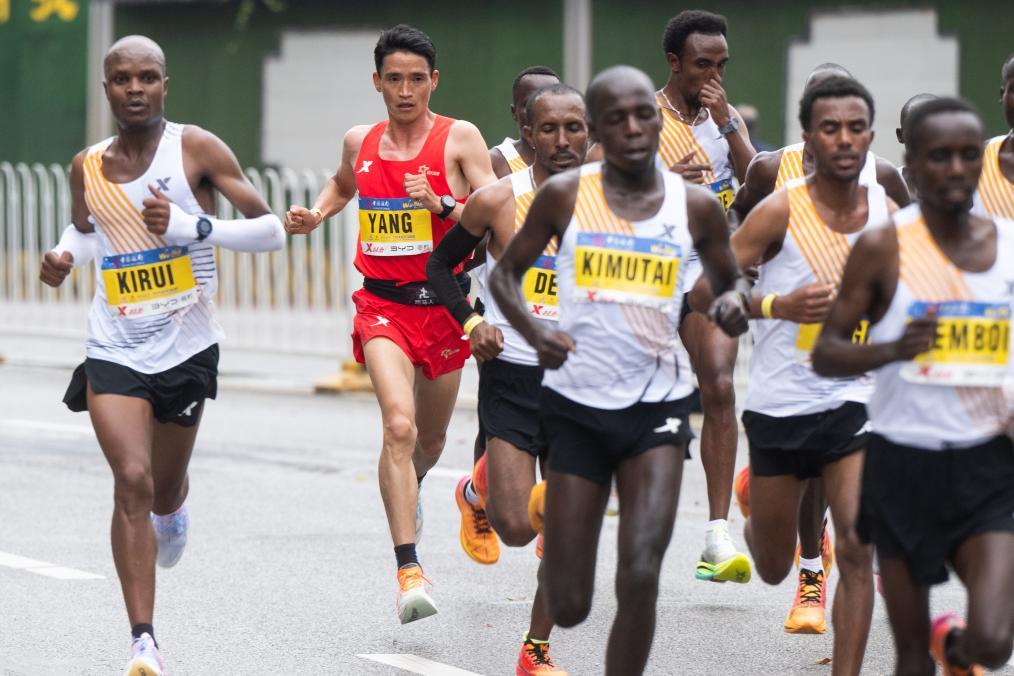3月24日,中國選手楊定宏(左二)在比賽中。他以2小時12分06秒的成績成為全程馬拉松男子組首位沖線的中國選手。新華社記者 肖藝九 攝