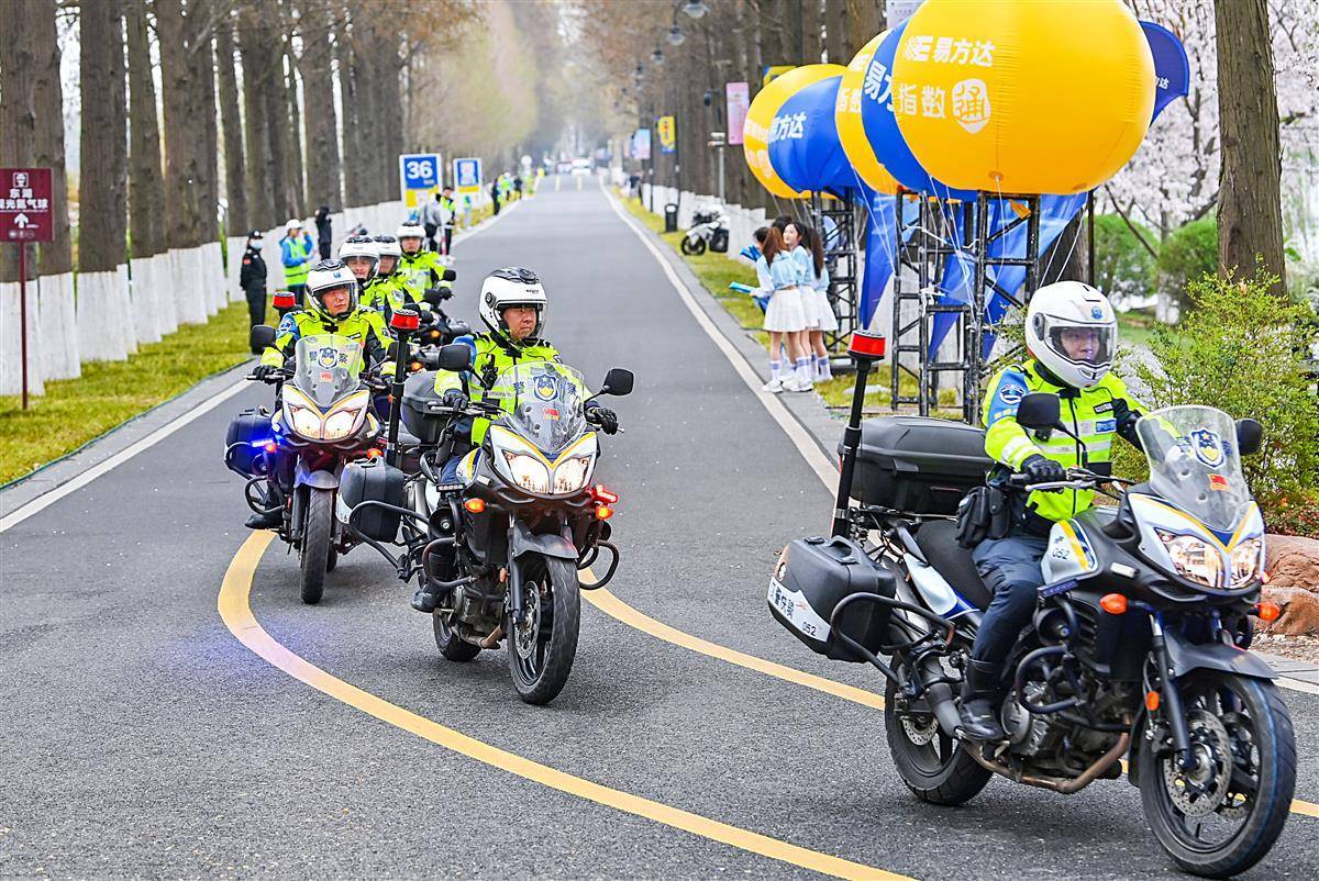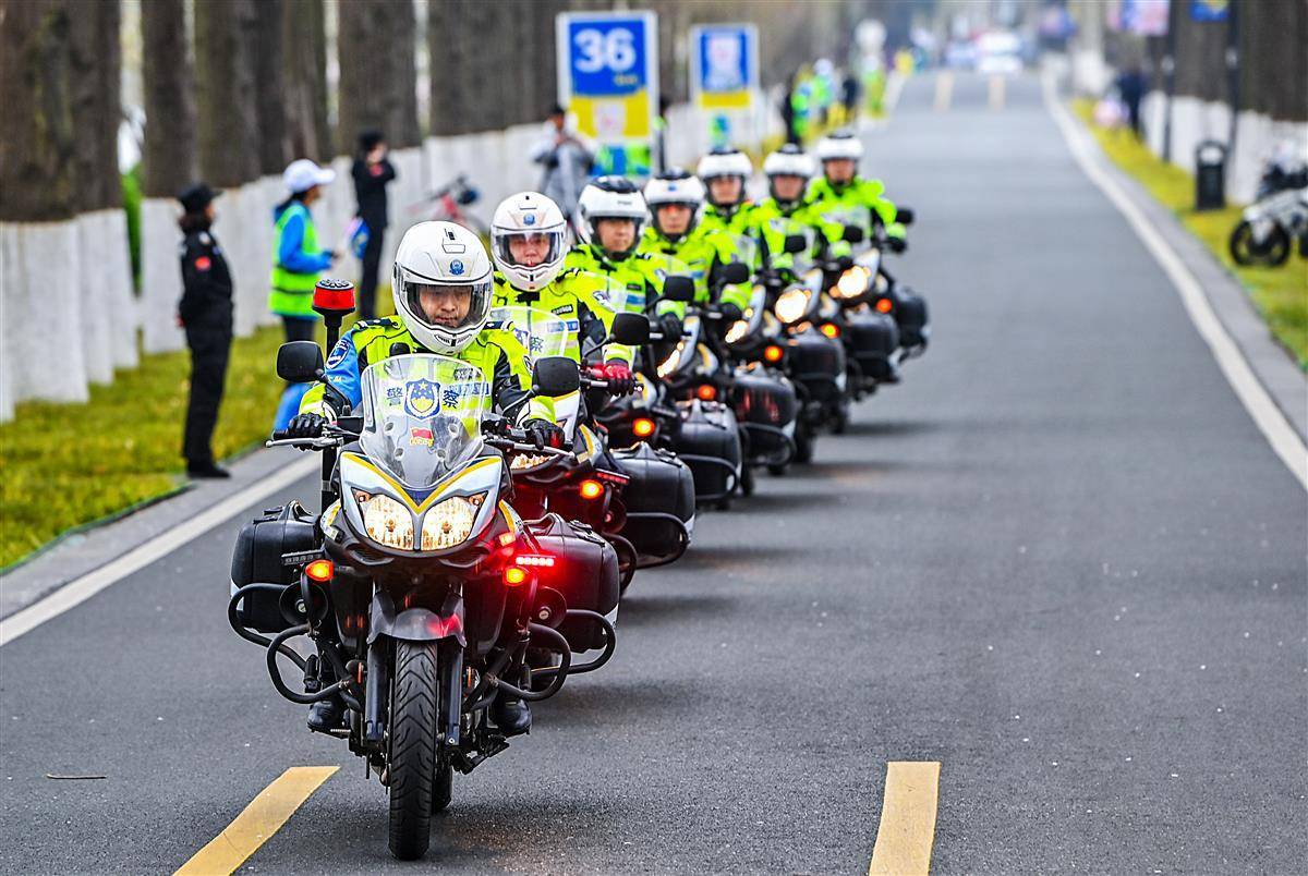 3月24日上午,武漢馬拉松東湖綠道九女墩賽段上,7輛警用摩托車為運動員開道,成為東湖綠道靚麗的“警”色。