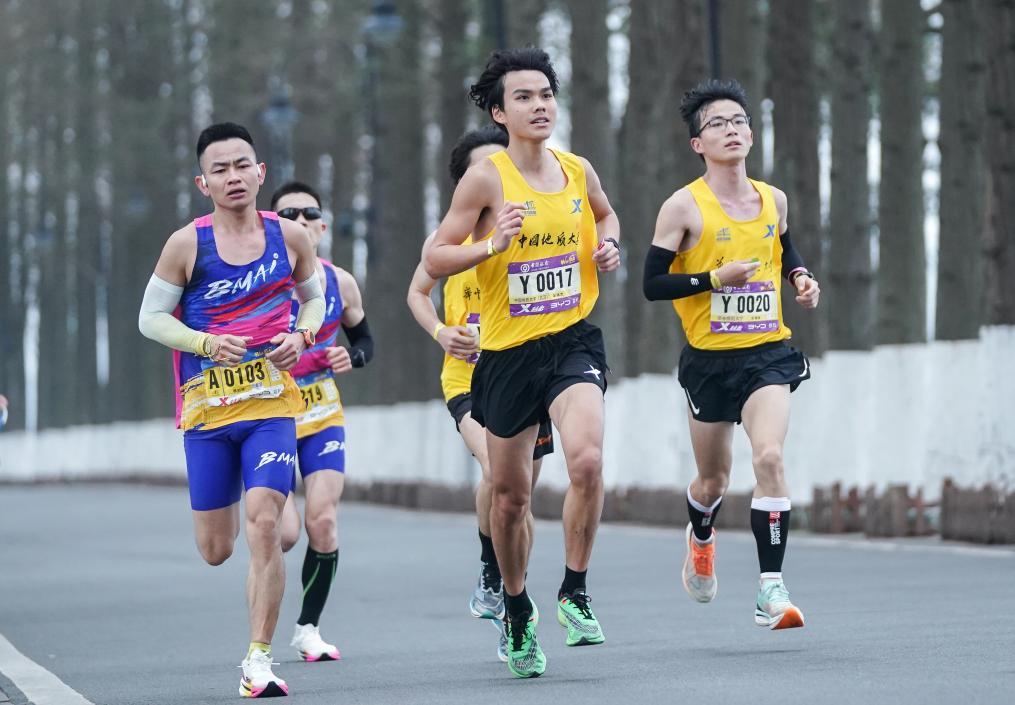 3月24日,中國選手楊定宏(左二)在比賽中。他以2小時12分06秒的成績成為全程馬拉松男子組首位沖線的中國選手。新華社記者 肖藝九 攝