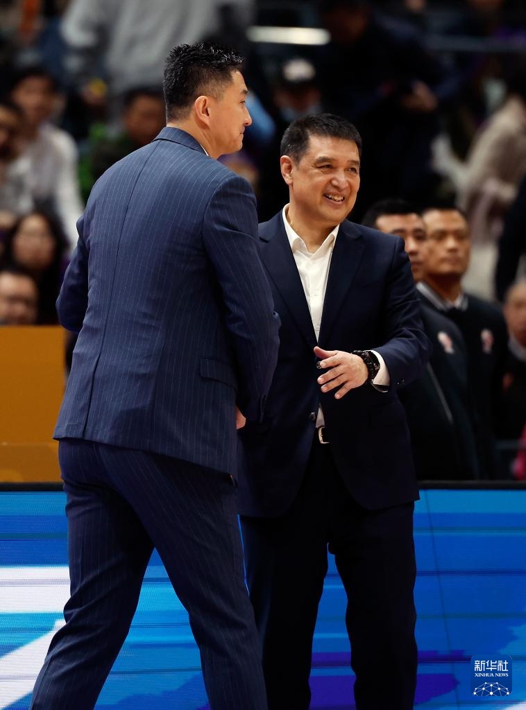 3月24日,北京控股隊主教練閔鹿蕾(右)在賽后與廣東華南虎隊主教練杜鋒互相致意。新華社記者 王麗莉 攝