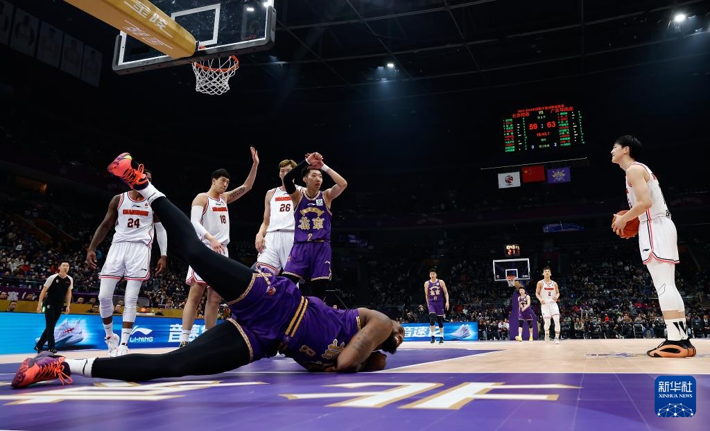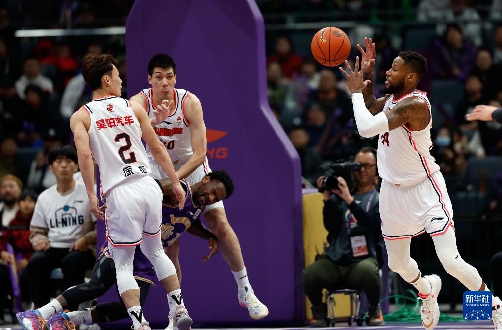 3月24日,北京控股隊球員廖三寧(紫衣2號)在比賽中向裁判員示意對方球員向隊友賈卡爾·桑普森(下)犯規。新華社記者 王麗莉 攝