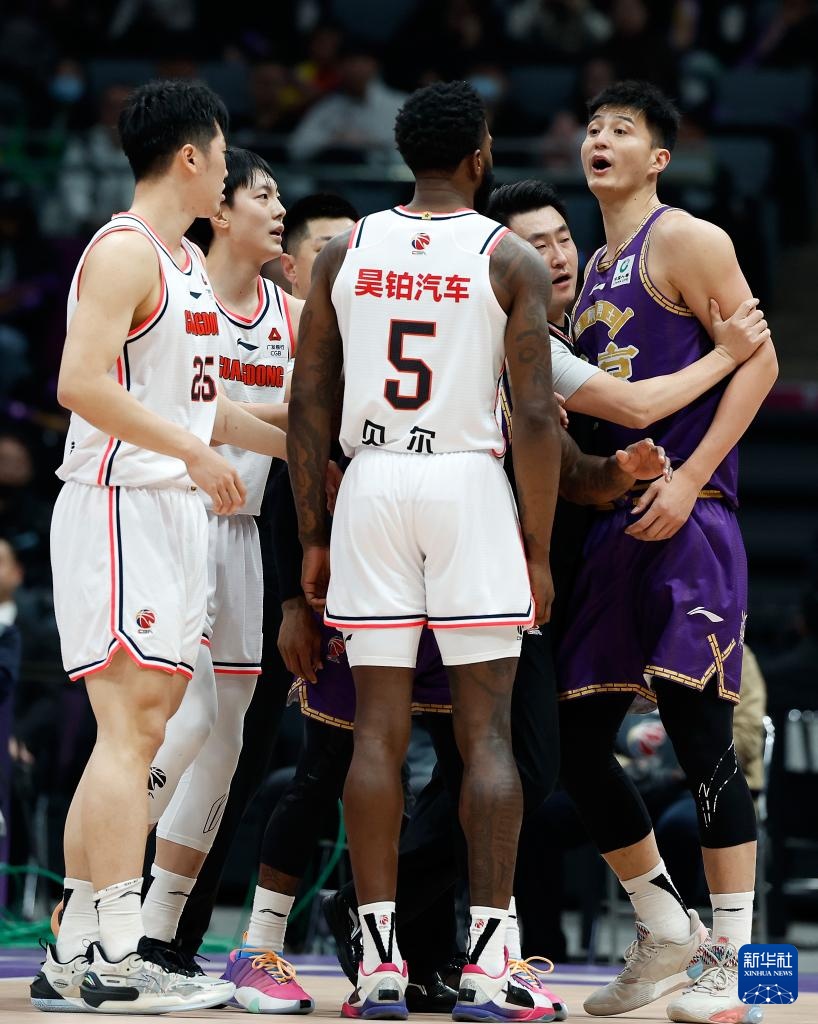 3月24日,北京控股隊球員俞長棟(右一)在比賽中向廣東華南虎隊球員喬丹·貝爾(右三)表達不滿。新華社記者 王麗莉 攝