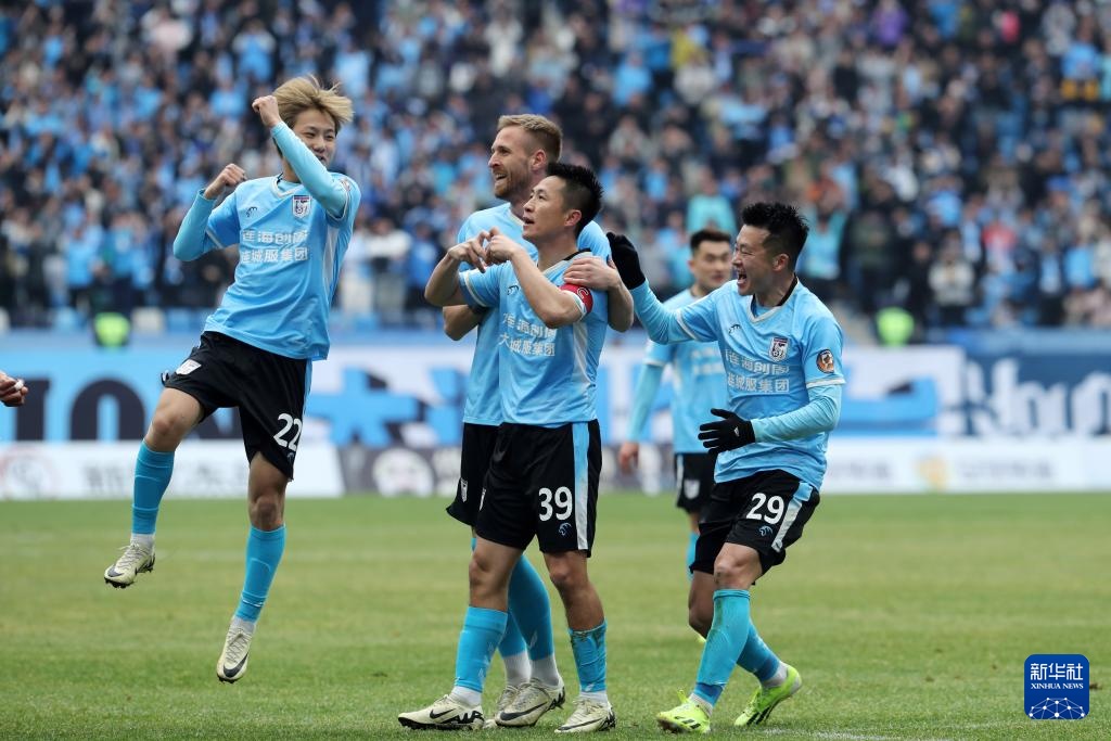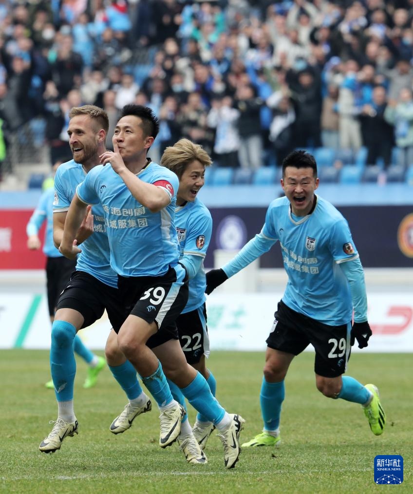 3月24日,大連英博隊(duì)球員閻相闖(左三)慶祝進(jìn)球。新華社記者 李鋼 攝