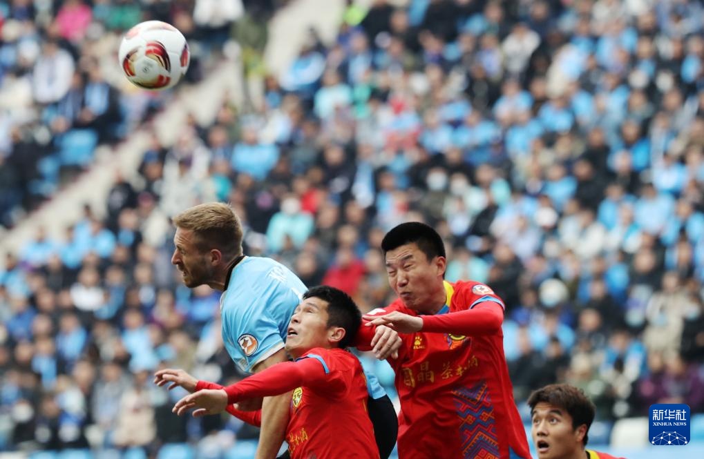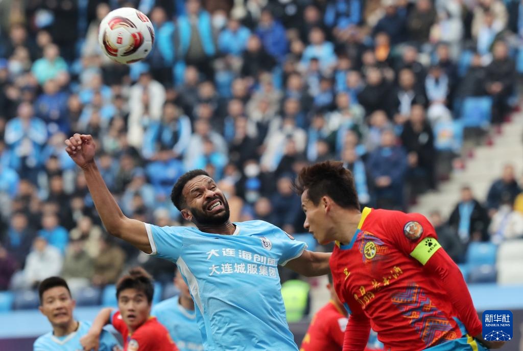 3月24日,大連英博隊(duì)球員科特尼克(左一)在比賽中爭頂。新華社記者 李鋼 攝