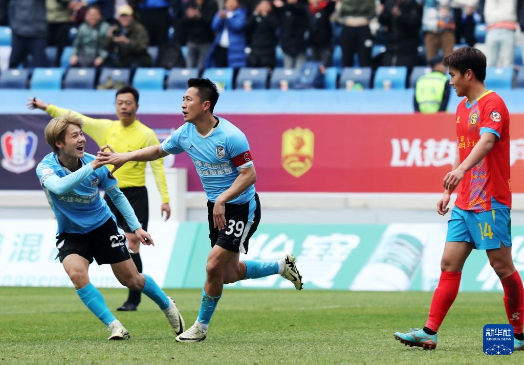 3月24日,大連英博隊(duì)球員閻相闖(左二)慶祝進(jìn)球。新華社記者 李鋼 攝