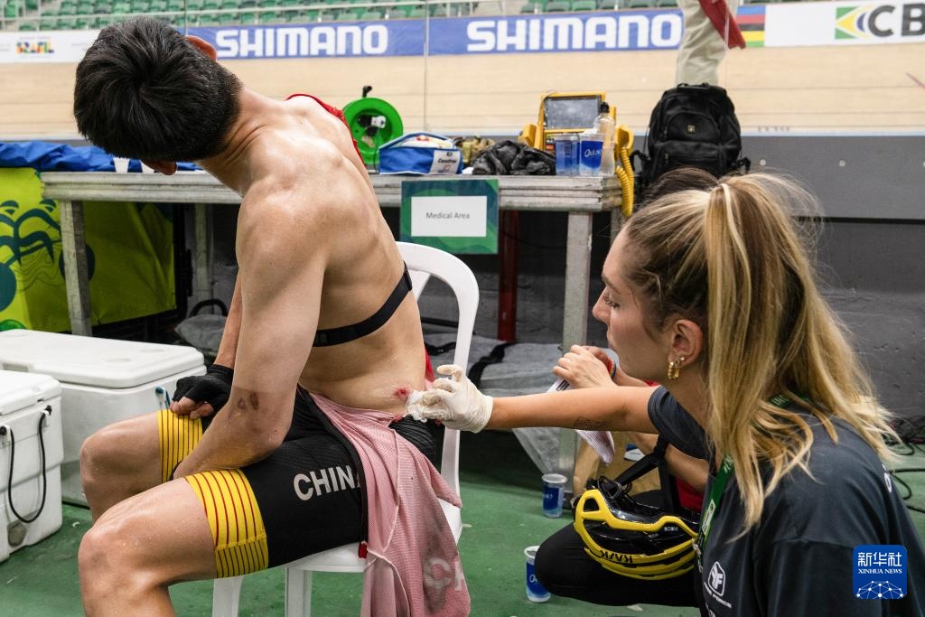 3月24日,中國選手梁偉聰(左)在男子C1級捕捉賽后接受治療。新華社記者 王天聰 攝
