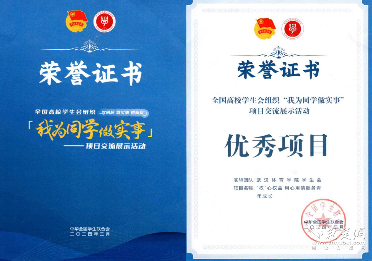 經學校自薦、省級推報、全國遴選,武漢體育學院學生會“‘權’心權益 用心用情服務青年成長”項目在全國1724所高校、3581個項目中脫穎而出,獲得“我為同學做實事”優秀項目(全國共300項,其中普通本科院校學生會項目182項)。