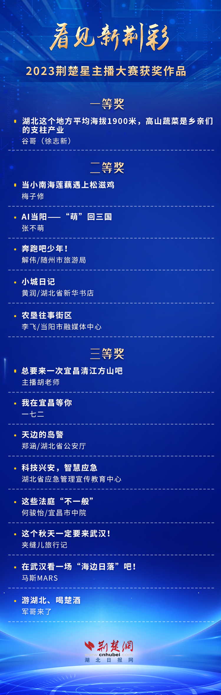 看見新荊彩,助力新發展。2023年底,由湖北省委網信辦、湖北省文化和旅游廳、湖北省互聯網業聯合會指導,荊楚網(湖北日報網)主辦的“2023荊楚星主播大賽”獲獎名單揭曉,千名主播踴躍參與,競相推介魅力湖北,涌現出一大批優秀主播作品。大會現場發布了“2023荊楚星主播大賽”獲獎名單并頒獎(獲獎名單見下圖)。