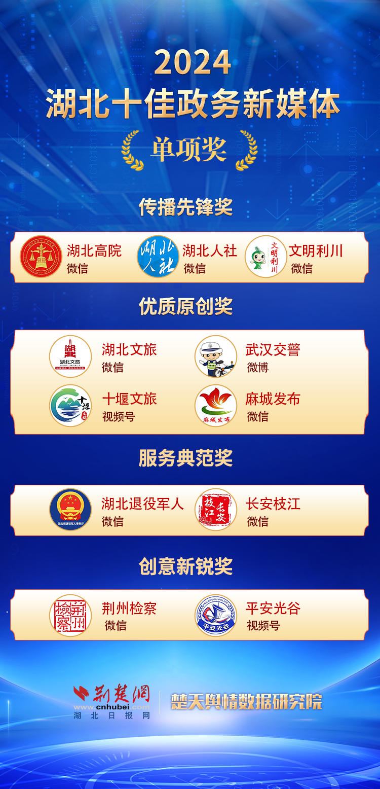 數讀融媒亮點,助力政務傳播。2月21日,由荊楚網(湖北日報網)、楚天輿情數據研究院主辦的2024“湖北十佳政務新媒體”評選活動啟動,共有363個賬號報名參與,活動覆蓋面不斷擴大,影響力日益增強。大會現場揭曉了2024“湖北十佳政務新媒體”獲獎名單并頒獎,還公布了單項獎(獲獎名單見下圖)。