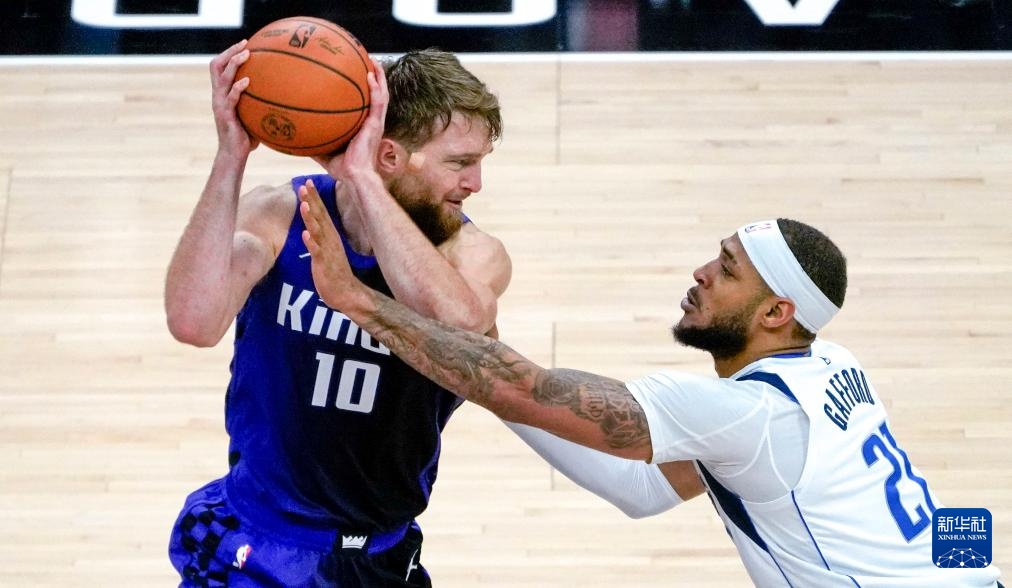 3月26日,獨行俠隊球員馬克西·克勒貝爾(左)與國王隊球員杜阿爾特在比賽中拼搶。新華社記者 吳曉凌 攝