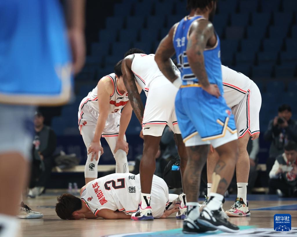 3月27日,廣東華南虎隊球員徐杰(下)在比賽中受傷倒地。新華社記者 張晨 攝