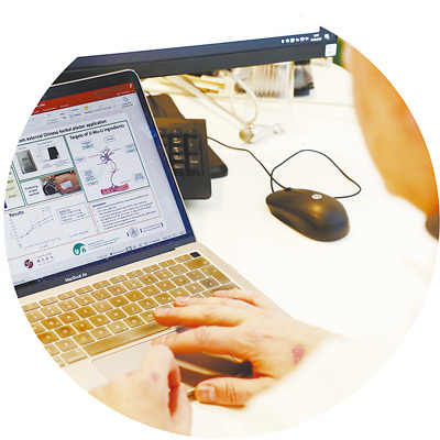 德國中醫藥專家、漢堡大學附屬埃彭多夫醫院漢薩美安中醫中心主任斯文·施羅德展示該中心與上海中醫藥大學附屬曙光醫院的聯合科研項目“中醫藥在延緩漸凍癥發展中的臨床表現”。