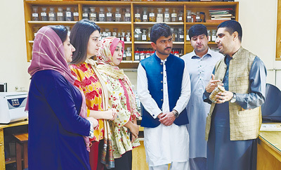 在巴基斯坦伊斯蘭堡真納大學,中醫藥用植物研究團隊帶頭人穆什塔克·艾哈邁德教授(右一)向學生們介紹中醫藥用植物的使用方式和功效。