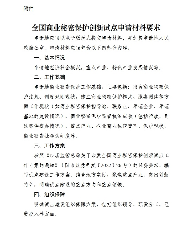 (一)試點申請。各地人民政府根據本地區商業秘密保護工作情況和發展需求,自愿提出創新試點申請,認真準備申請材料(要求見附件)并提交至省級市場監管部門。