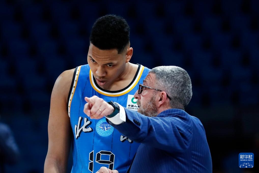 3月29日,北京北汽隊(duì)球員塔瑞克(左)接受主教練喬里歐·格里喬里的指導(dǎo)。新華社記者 雒圓 攝