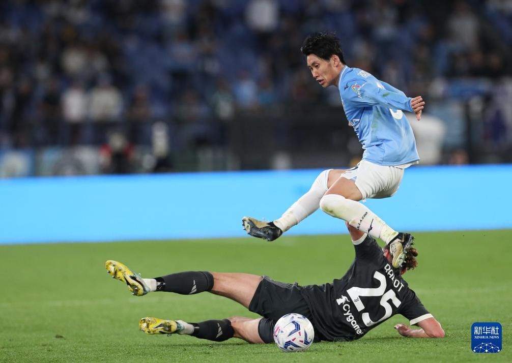 3月30日,拉齊奧隊(duì)球員鐮田大地(上)與尤文圖斯隊(duì)球員拉比奧在比賽中拼搶。