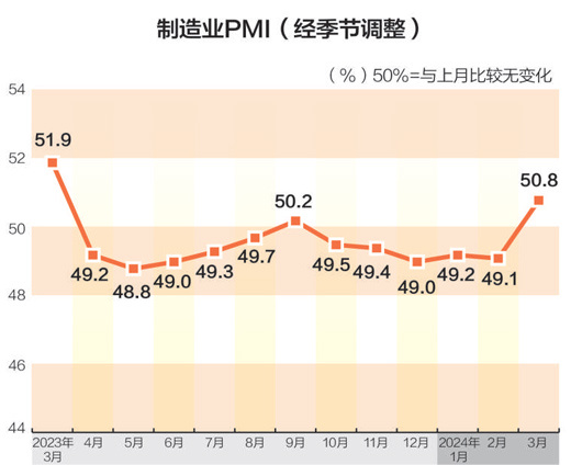 四大行業聯動回升,產業鏈供應鏈有序恢復。3月份,在大規模設備更新政策對相關行業需求預期拉動下,制造業新動能呈現較快增長勢頭。裝備制造業PMI為51.6%,較上月上升2.1個百分點;高技術制造業PMI為53.9%,較上月上升3.1個百分點,創2022年以來新高。消費品制造業PMI為51.8%,較上月上升1.8個百分點,顯示消費品制造業也穩中有增。消費品以舊換新帶動汽車、家電及家裝等行業市場需求預期釋放。基礎原材料行業PMI為49.1%,較上月上升1.2個百分點,顯示制造業整體回升帶動基礎原材料行業趨穩運行。
