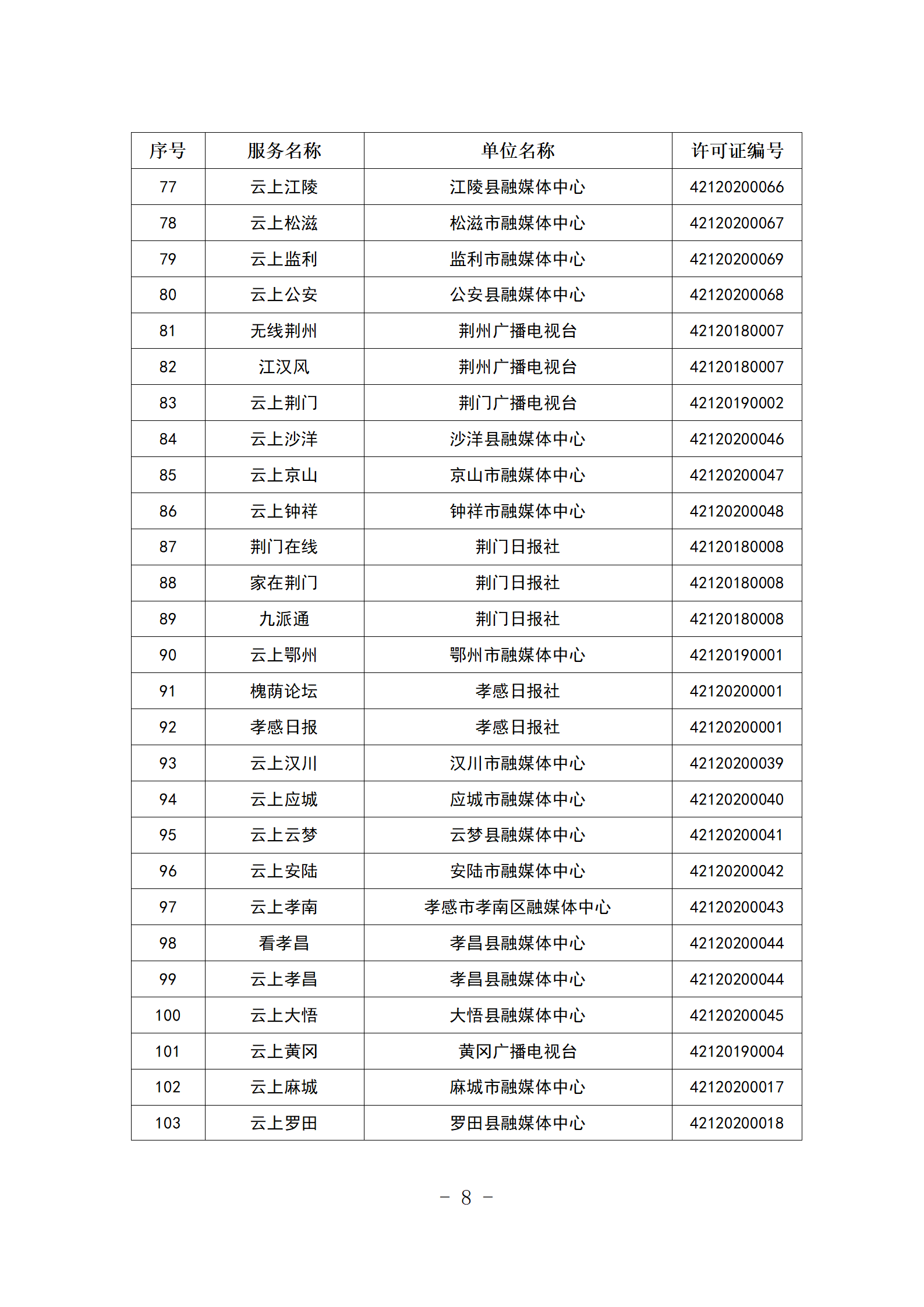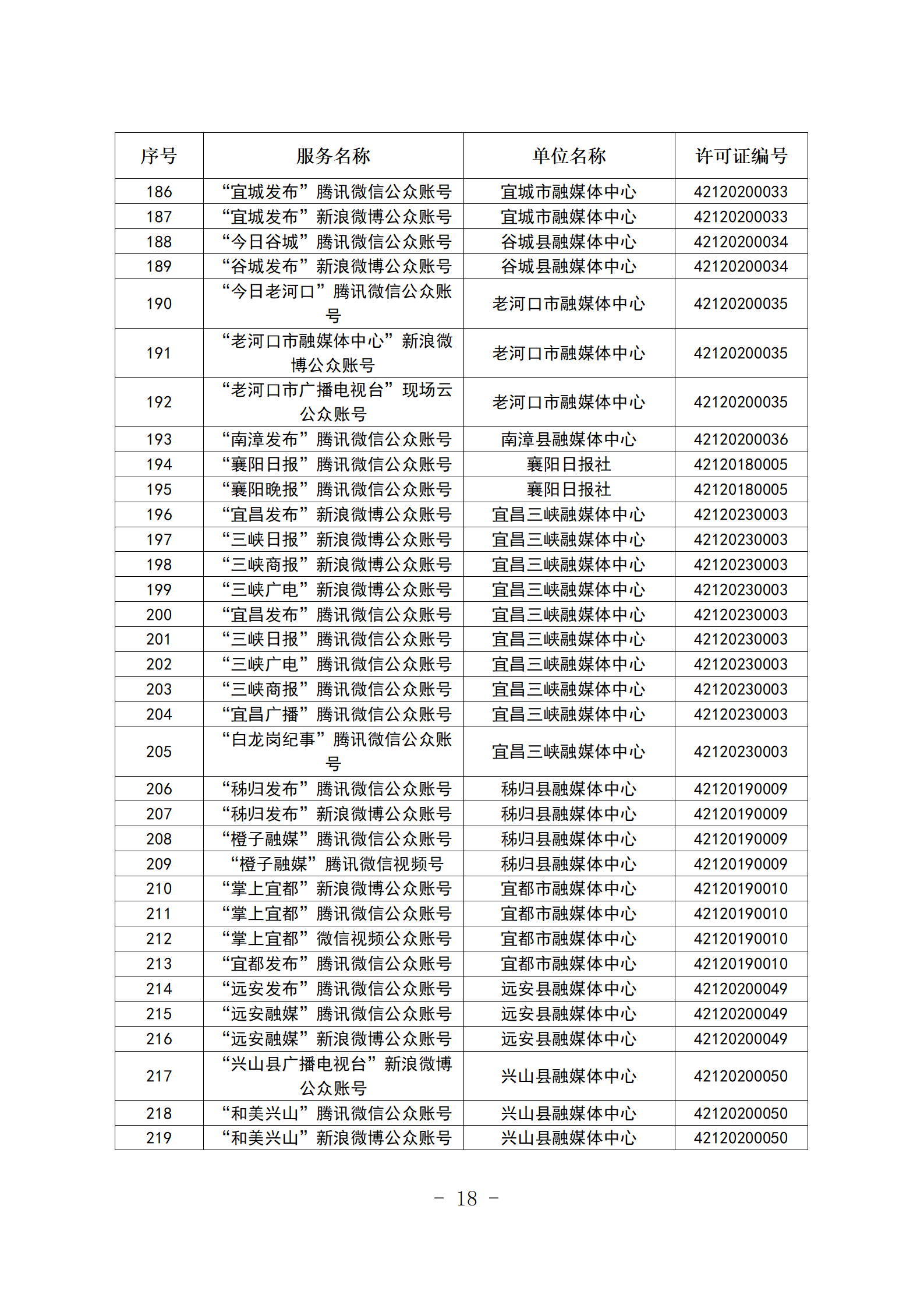 按照國(guó)家網(wǎng)信辦統(tǒng)一部署,湖北省網(wǎng)信辦依法組織開(kāi)展了屬地互聯(lián)網(wǎng)新聞信息服務(wù)許可證的申請(qǐng)、續(xù)辦和變更工作,現(xiàn)將湖北省112家互聯(lián)網(wǎng)新聞信息服務(wù)單位取得的相關(guān)許可信息予以公開(kāi),包括:互聯(lián)網(wǎng)站93個(gè),應(yīng)用程序138個(gè),論壇11個(gè),公眾賬號(hào)439個(gè),其他4個(gè),共計(jì)685個(gè)服務(wù)項(xiàng)。