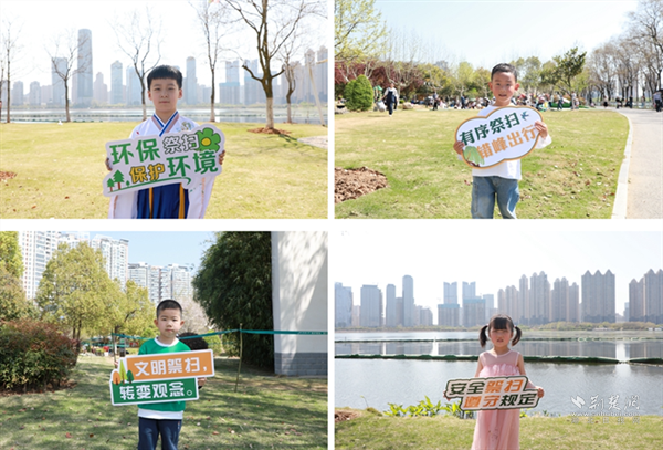 孩子們手持“文明祭掃”口號(hào)手舉牌,向往來市民展開宣傳。 圖片來源:武漢文明網(wǎng)