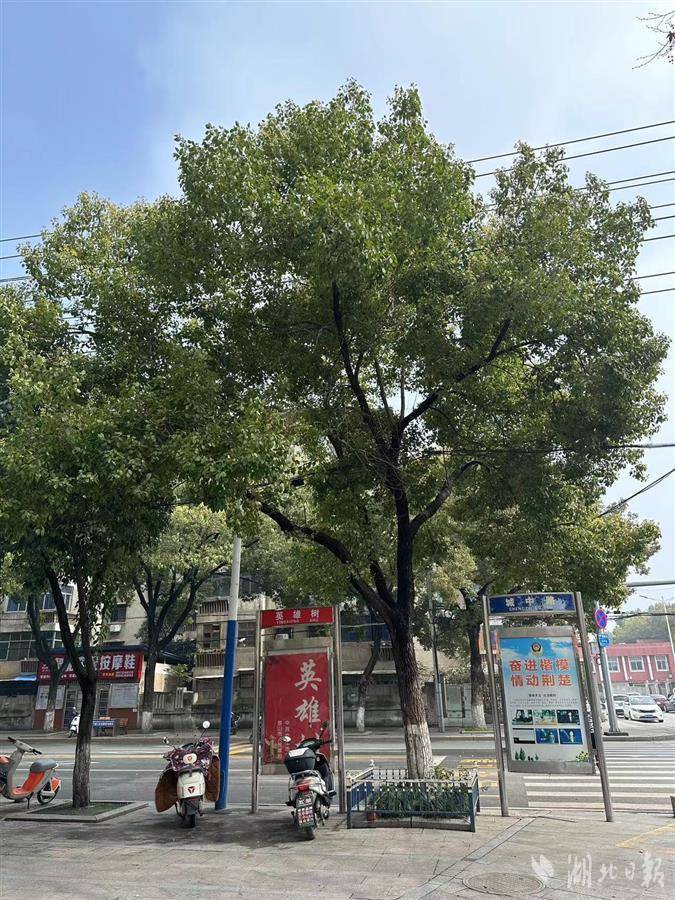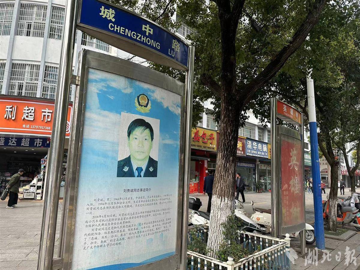 3月28日,京山市城中路實(shí)驗(yàn)小學(xué)路段,烈士、原京山市公安局交警大隊(duì)一中隊(duì)副中隊(duì)長(zhǎng)劉貴斌的照片和事跡簡(jiǎn)介立于路邊。記者看到,一旁的“英雄樹(shù)”昂然挺立,枝繁葉茂。