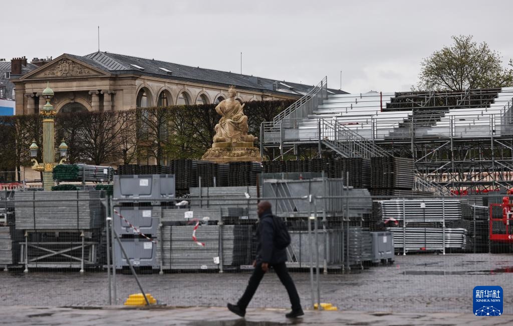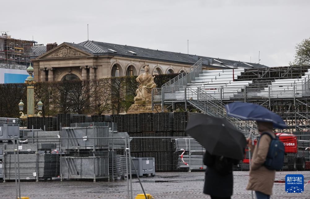 4月2日,行人經過法國巴黎協和廣場的奧運比賽場地和看臺建設工地。新華社記者 高靜 攝
