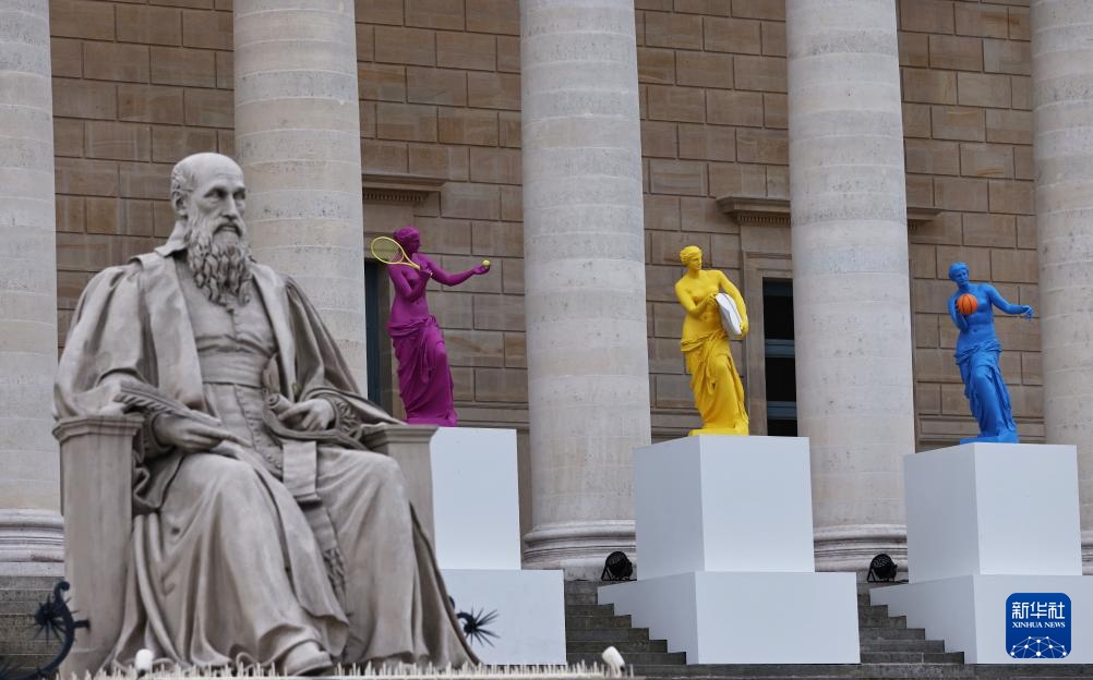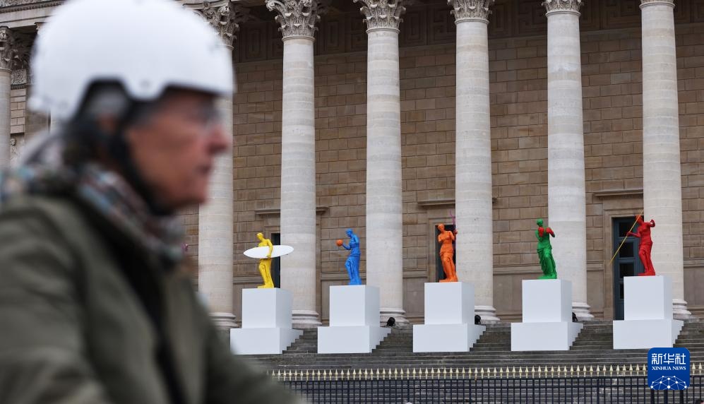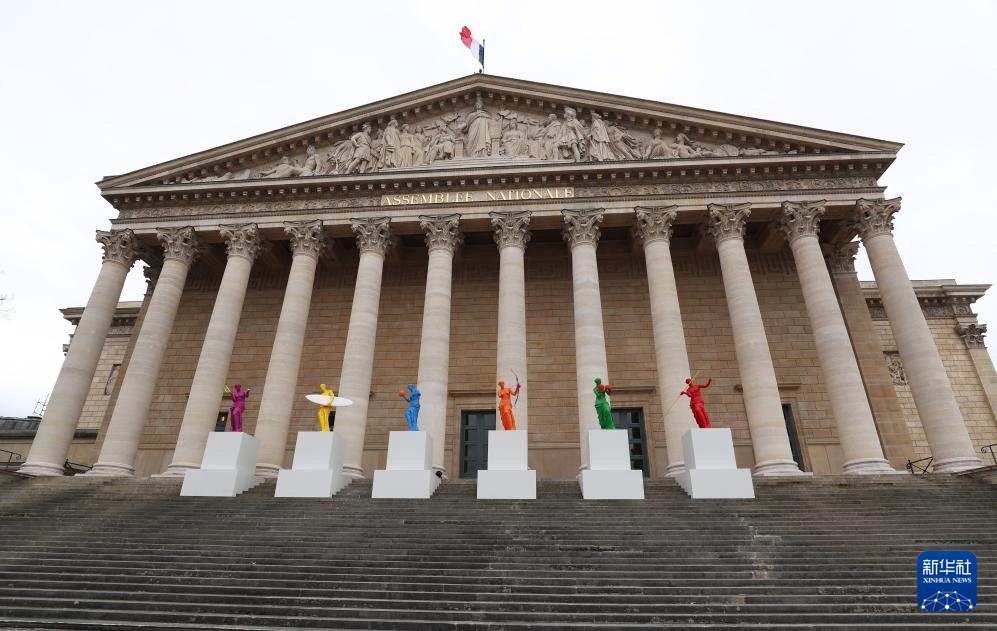 這是4月2日在法國巴黎國民議會前拍攝的奧運主題雕像。新華社記者 高靜 攝