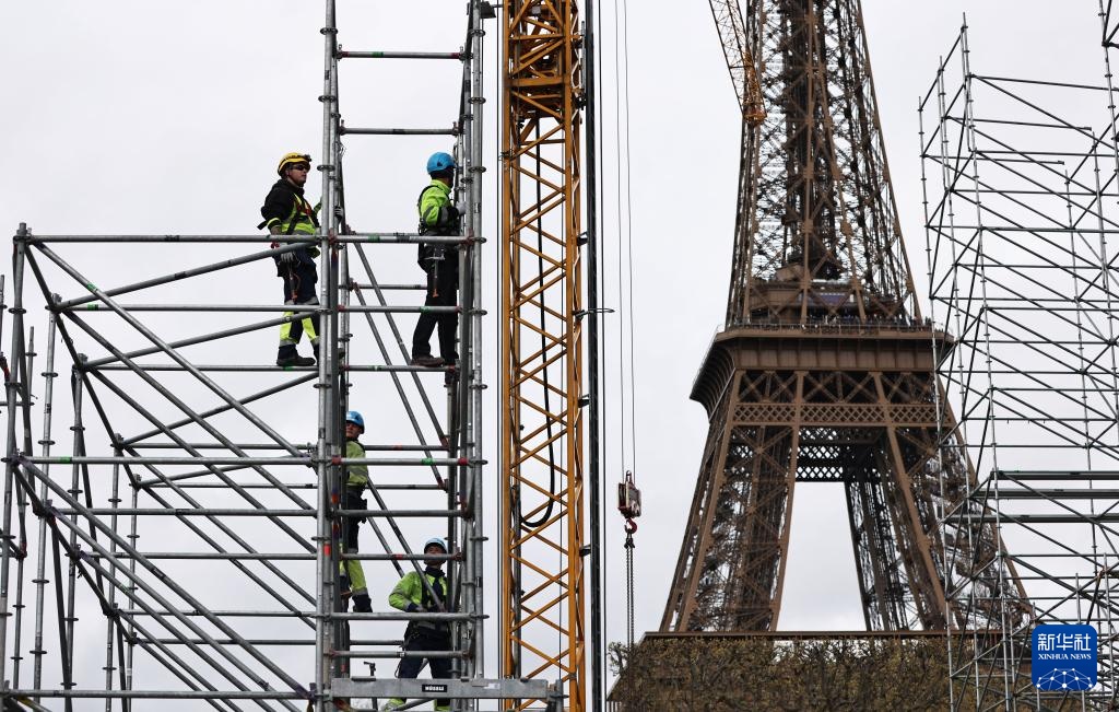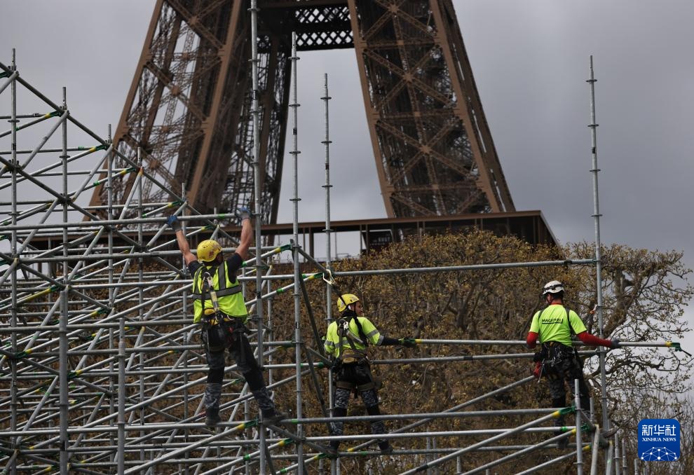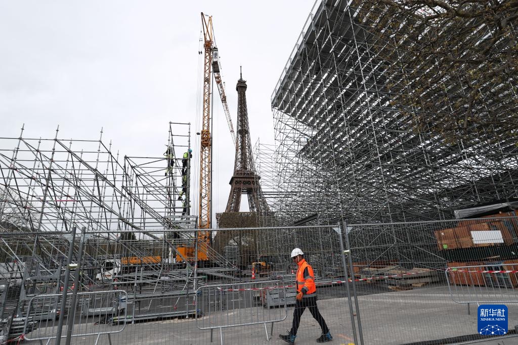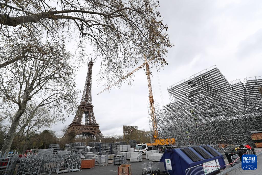 4月2日,在法國巴黎埃菲爾鐵塔附近的戰神廣場,工人在奧運比賽場地和看臺搭建現場忙碌。新華社記者 高靜 攝