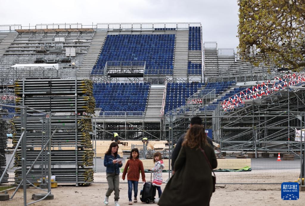 4月2日,行人經過法國巴黎埃菲爾鐵塔附近戰神廣場的奧運比賽場地和看臺建設工地。新華社記者 高靜 攝