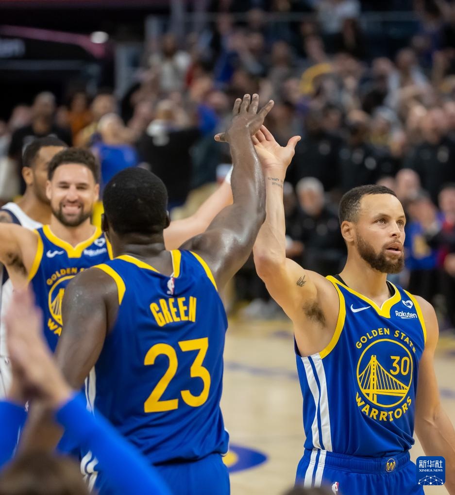 4月2日,勇士隊球員庫里(右)在比賽中與隊友慶祝。新華社發(董旭東攝)