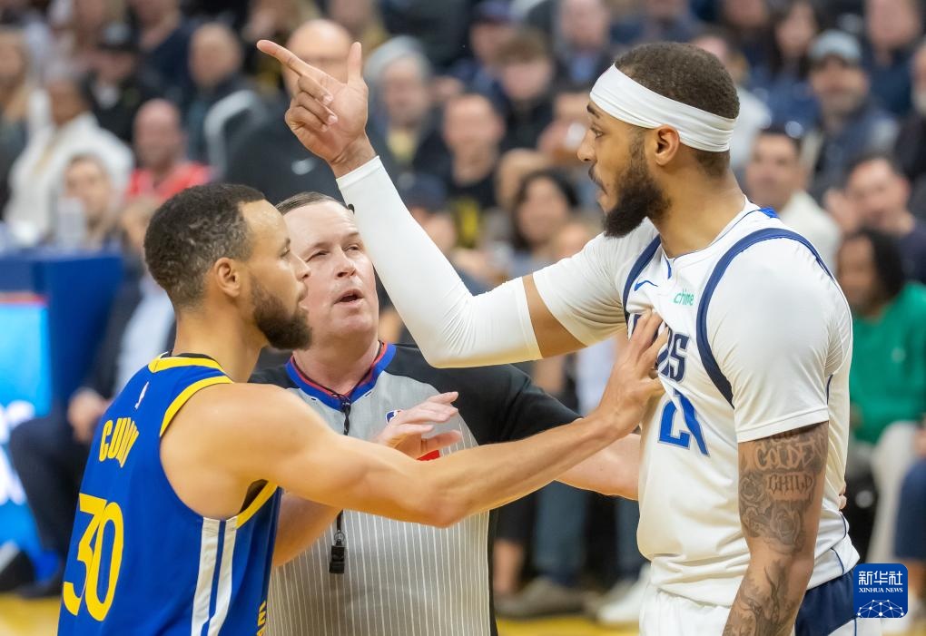 4月2日,獨行俠隊球員丹尼爾·加福德(右)與勇士隊球員庫里在比賽中發生爭執。新華社發(董旭東攝)