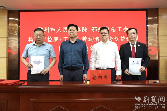 會議通報了鄂州市總工會在新形勢下維護勞動者合法權益存在的堵點、難點問題及對策建議,通報了鄂州市人民檢察院近三年來,辦理的涉及勞動者權益保障案件相關情況。雙方會簽《鄂州市人民檢察院 鄂州市總工會關于構建“檢察+工會”勞動者合法權益保障協作機制的實施意見》。