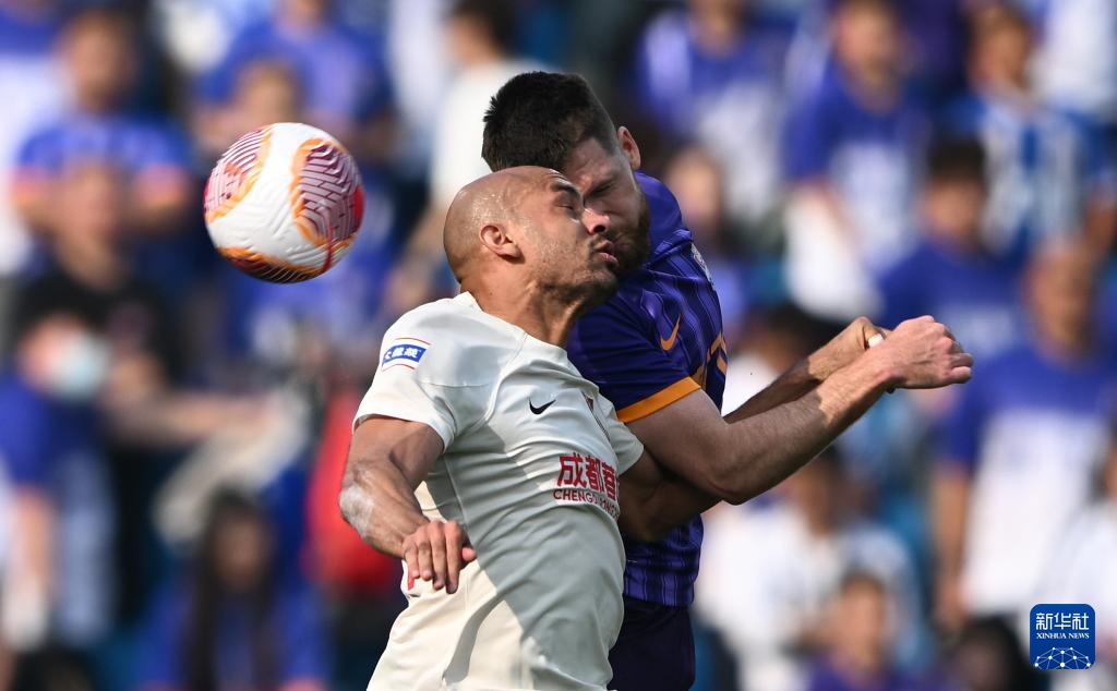 4月6日,成都蓉城隊球員費利佩(左)在比賽中與天津津門虎隊球員格蘭特爭頂。新華社記者 孫凡越 攝