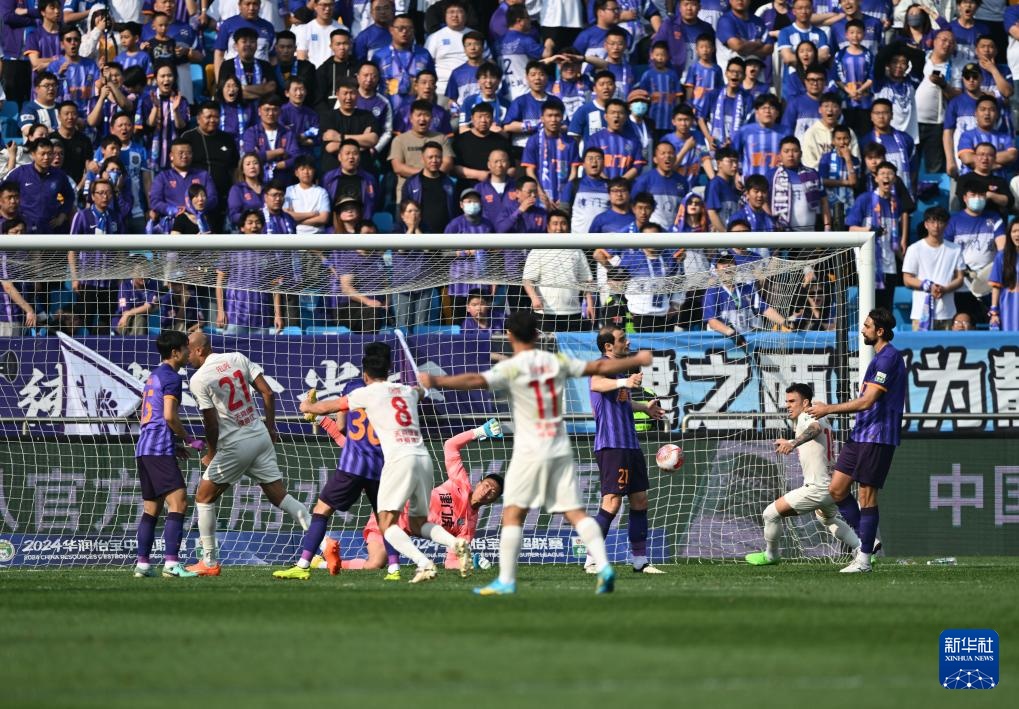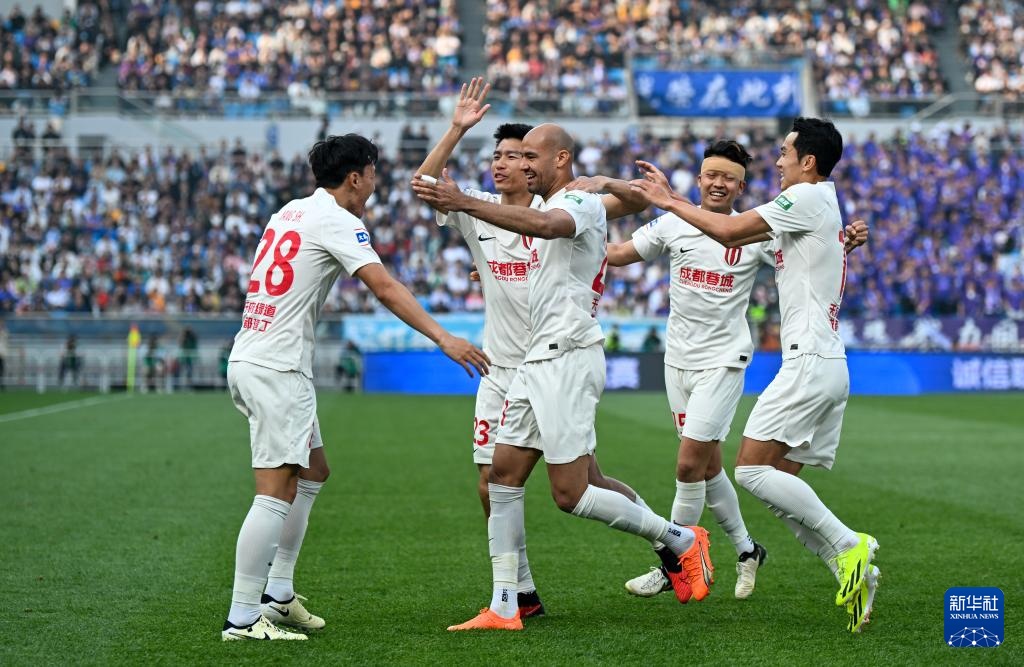 4月6日,成都蓉城隊球員費利佩(左二)在比賽中打入本場比賽個人第一粒進球。新華社記者 孫凡越 攝