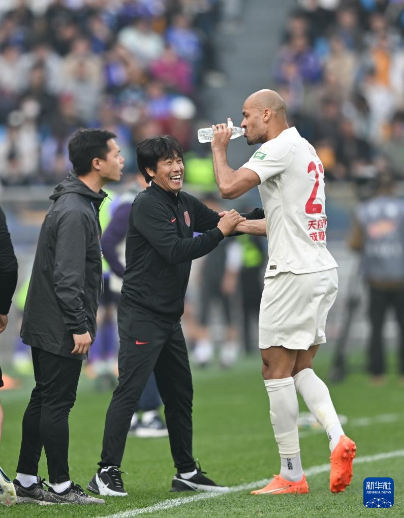 4月6日,成都蓉城隊主教練徐正源(右二)慶祝球員費利佩(右一)在比賽中梅開二度。新華社記者 孫凡越 攝