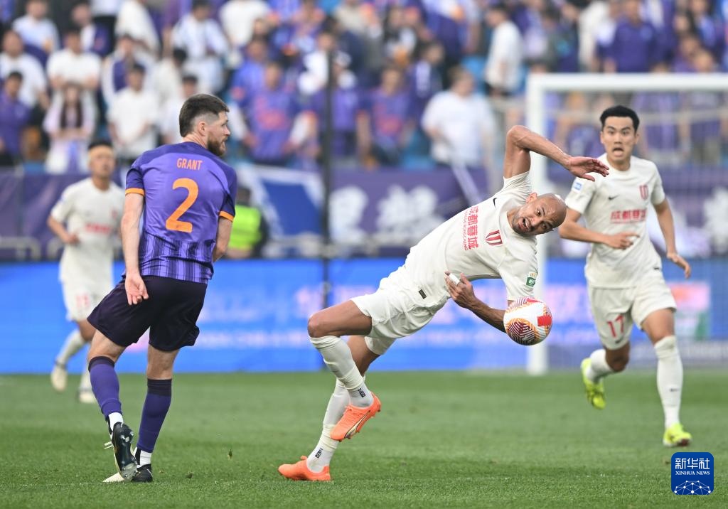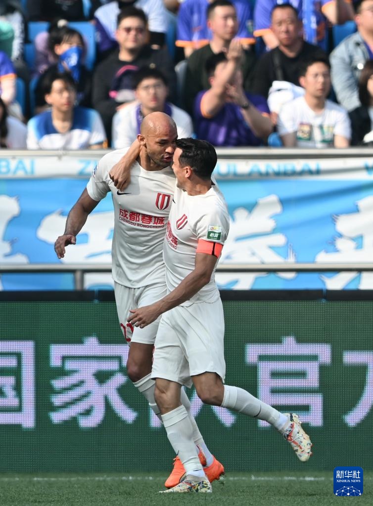 4月6日,成都蓉城隊球員費利佩(右二)在比賽中。新華社記者 孫凡越 攝