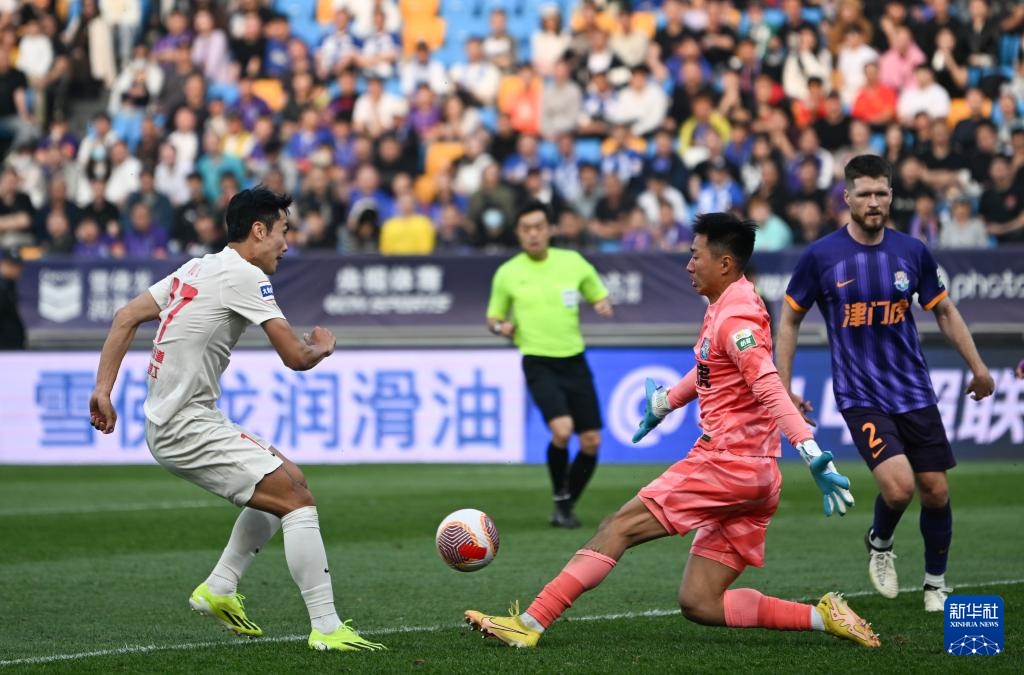 4月6日,天津津門虎隊守門員方鏡淇(右二)封擋出成都蓉城隊球員吳雷(左一)的射門。新華社記者 孫凡越 攝