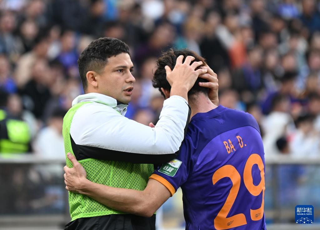 4月6日,成都蓉城隊球員艾克森(左)安慰被替換下場的天津津門虎隊球員巴頓。新華社記者 孫凡越 攝