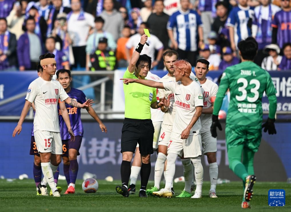 4月6日,主裁判金京元(左三)向成都蓉城隊球員韋世豪(右三)出示黃牌。新華社記者 孫凡越 攝