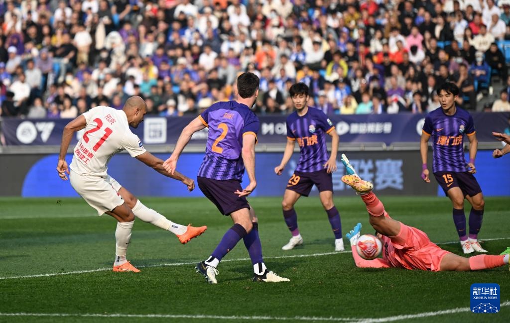 4月6日,成都蓉城隊球員費利佩(左)在禁區(qū)內(nèi)射門得分,打入本場比賽個人第二粒進球。新華社記者 孫凡越 攝