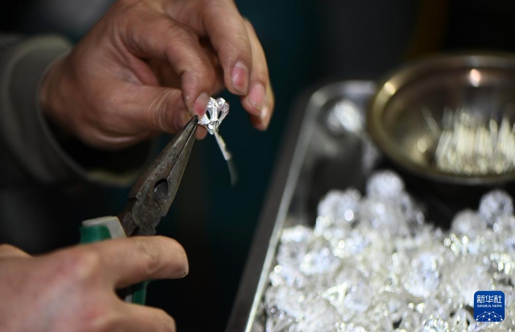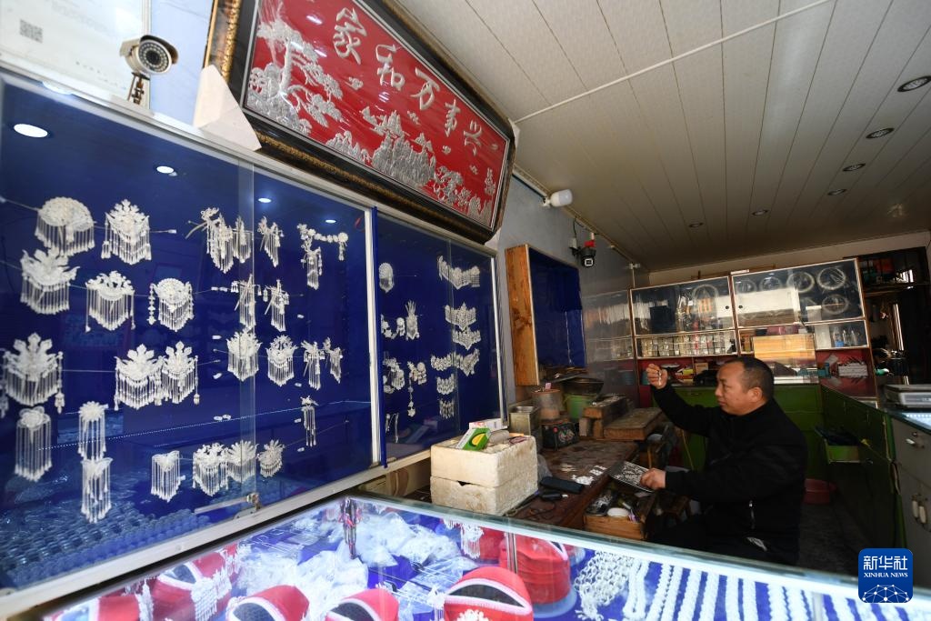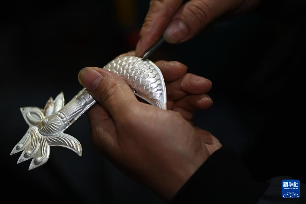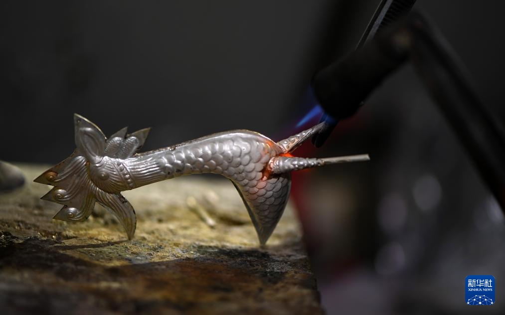 4月8日,手藝人在貴州省黃平縣新州鎮文星社區一家銀飾店內制作銀飾。